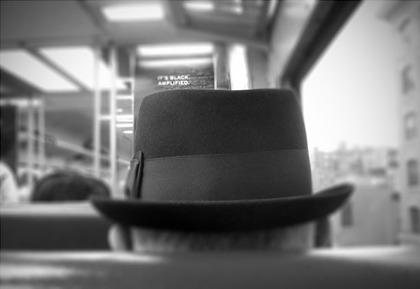 The image of the man on the train with a pork pie hat was truly unexpected for me. I didn’t notice the perfectly placed words in the Johnny Walker Black ad till I was reviewing the photos at home. This is the only image in the show heavily manipulated. I made the image black and white, to hide the color of the man’s brown hat and gray hair. I also added the blur to alter the focal point in the image. I was compelled to take this photo because it was days before the series finally of the TV show Breaking Bad and the main character wore a similar hat.