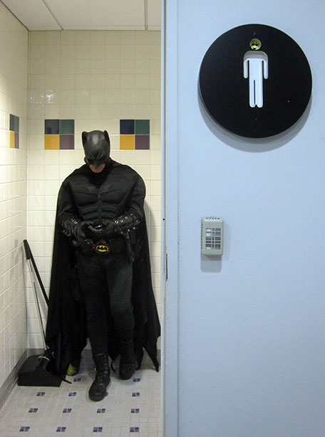 The image of Batman in a rest room was a guy in costume at Comic-Con NYC. And since he is continually asked to pose for photographs, the only place he could find time to himself was in the restroom. I also found the symbol for the men’s room to be an unexpected juxtaposition of the dark figure of Batman.